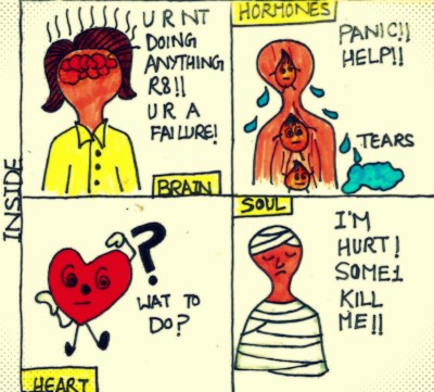 Now again, lets change this scenario a bit. You are in your bedroom, in your warm and cosy bed, trying to get up but you can’t. You have inexplicable body ache but no symptom of cold or flu. You feel exhausted and restless at the same time. You feel you have lost everything, even the will to live. The perfect day you had yesterday seems like a distant past. The ticking clock, the ringing cell phone, the mail alerts- mean nothing to you. You lie down again and think- what’s wrong with you? You message your boss- “Just a little under the weather. Taking an off. See you tomorrow.” He/she would reply with the usual monosyllable- TC. You feel relieved for a moment but start sulking again- all the moments of failure flash before your eyes. Suddenly you are envious of your friends, colleagues, Sharma ji’s son etc. A chemical locha happens and your one body one mind policy is breached. You hear four voices coming from four corners of your body: