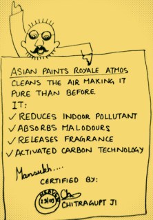 “By the way, for the people still slogging it out on earth, here’s a chance to improve your indoor air quality- Asian Paints have come up with an innovative product. Royale Atmos is a first of its kind paint that not only looks beautiful, but also cleans the air making it purer than before. Its Activated Carbon technology reduces harmful pollutants from the air. Additionally, Royale Atmos also absorbs select household foul smells to make the air fresher. In fact, Royale Atmos is the first Asian Paints product to have a fragrance, instead of the normal chemical smell of paints.”