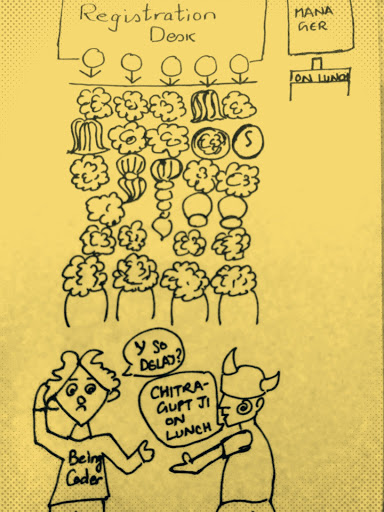 It was an unusually busy day. There was a long queue to the registration desk and the form to be filled was pretty long. I was already very upset over how the day went for me and now this mismanaged system was further pissing me off. There were scribes at the registration desk and candidates had to dictate everything. How inappropriate and old fashioned it was. First, in this 21st century when we are so used to give feedback on touch screen tablets, who use such laggard method and secondly, what about the privacy? I had to divulge my details in front of dozens of people. For the umpteenth time, I asked a volunteer about the delay. Uninterested, he replied to me that the manager was on lunch break and so there was a delay in allocation of seats. I asked him if this allocation was based on first come first serve basis or reservations? He got annoyed and said, “This place is beyond all politics, the allocations are made purely on the basis of merit. Even if you are a rainmaker, you can’t make a deal with His Highness Shri Shri Shri Chitragupt ji”.