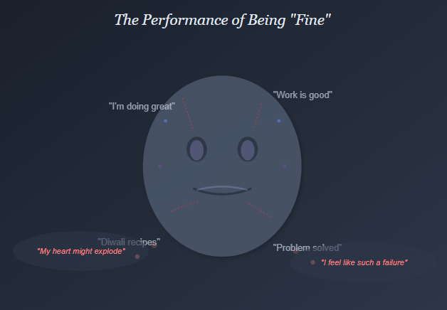 Something else was changing in me as well. I could see myself ageing- from a young girl to a middle-aged woman- someone who was supposed to run a household, raise a kid, hold a senior position at work, host guests, uphold the culture. Those people are sorted. I am not. So what do I do? Of course, pretend again. So, I do. Try. Try to fit in groups of grown-ups while yearning for heartfelt discussions about trivial matters like how you feel today. Ohh, I am so anxious. I think my heart would explode. But what I speak about instead is how I fixed a problem at work or what new recipes I am cooking this Diwali. Where does this lead me? Hyperventilating, overthinking about things I shouldn’t have said. Feeling like a failure scrolling through my Insta feed. Only if I were ten years younger.