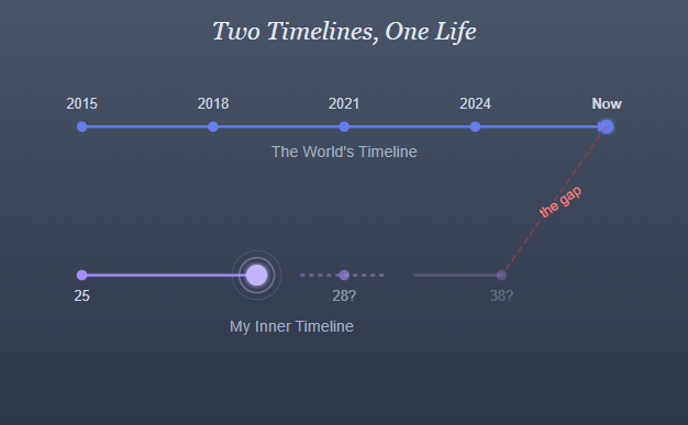 I’m writing this because I need to know I’m not alone in this time warp. Because maybe someone else out there is also 38 on paper and 25 in their bones, still waiting to catch up to a life that moved on without them.